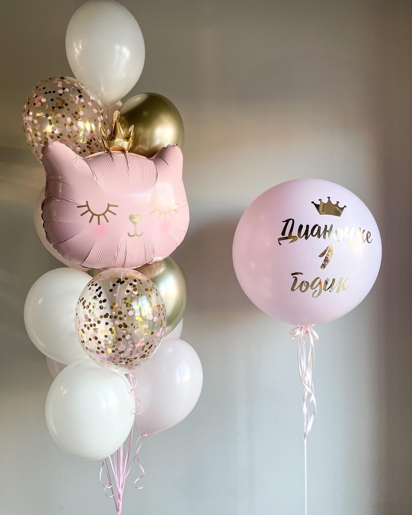 - Фонтан из 13 шаров: фигурка кошечка, 3 хром, 2 с конфетти и 7 однотонных