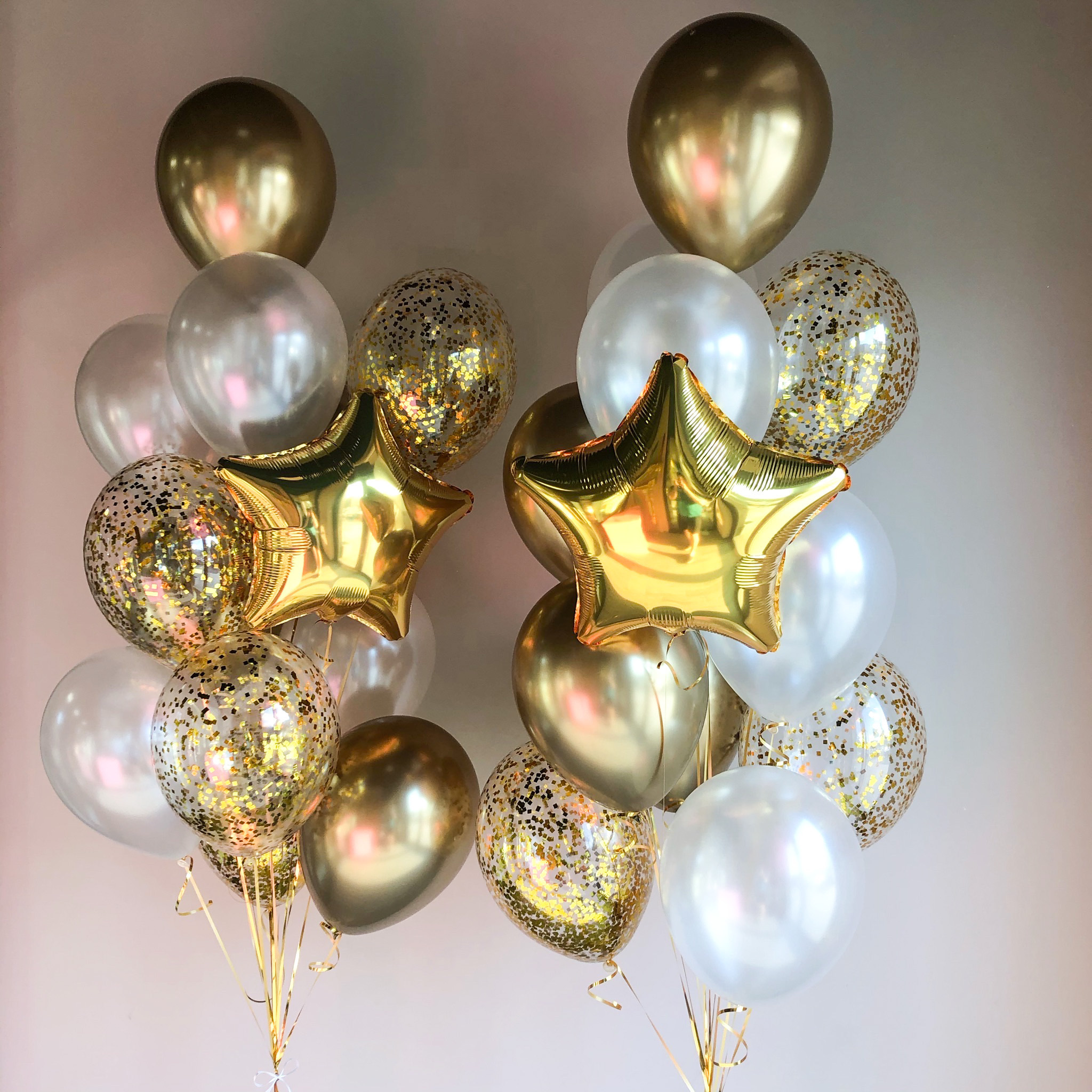 - Два Фонтана из 13 шаров: звезда, 4 хром, 4 с конфетти и 4 однотонных