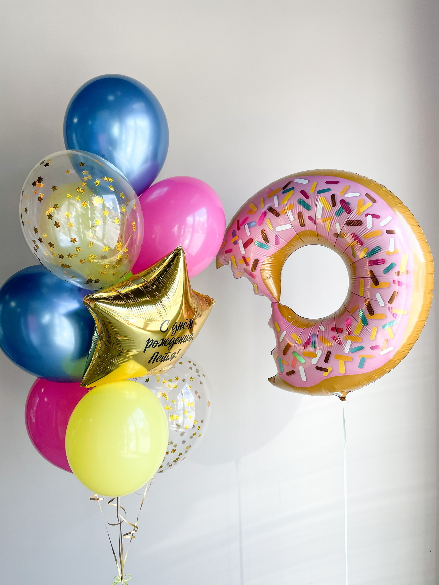 - Фонтан из 10 шаров: звезда с индивидуальной надписью, 2 с конфетти, 2 хром и 5 однотонных шаров.