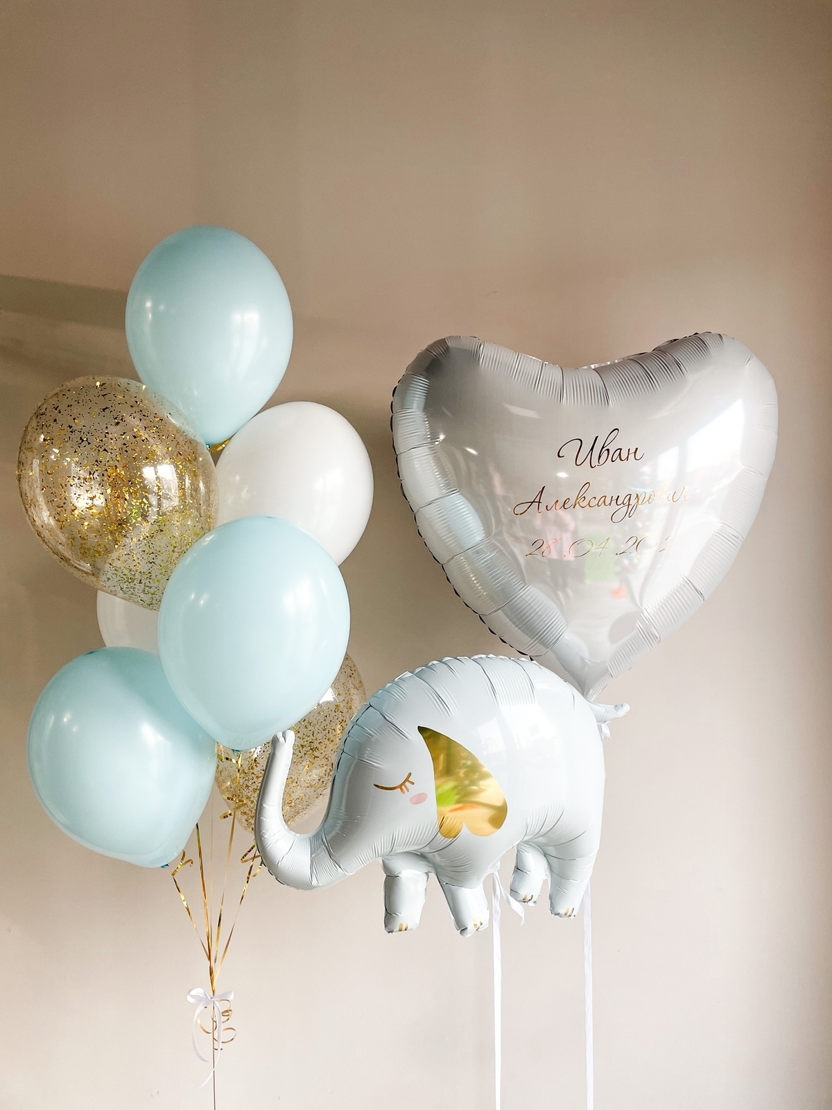 Фонтан из 7 шаров (3 голубой макарунс, 2 белых, 2 прозрачных с конфетти)